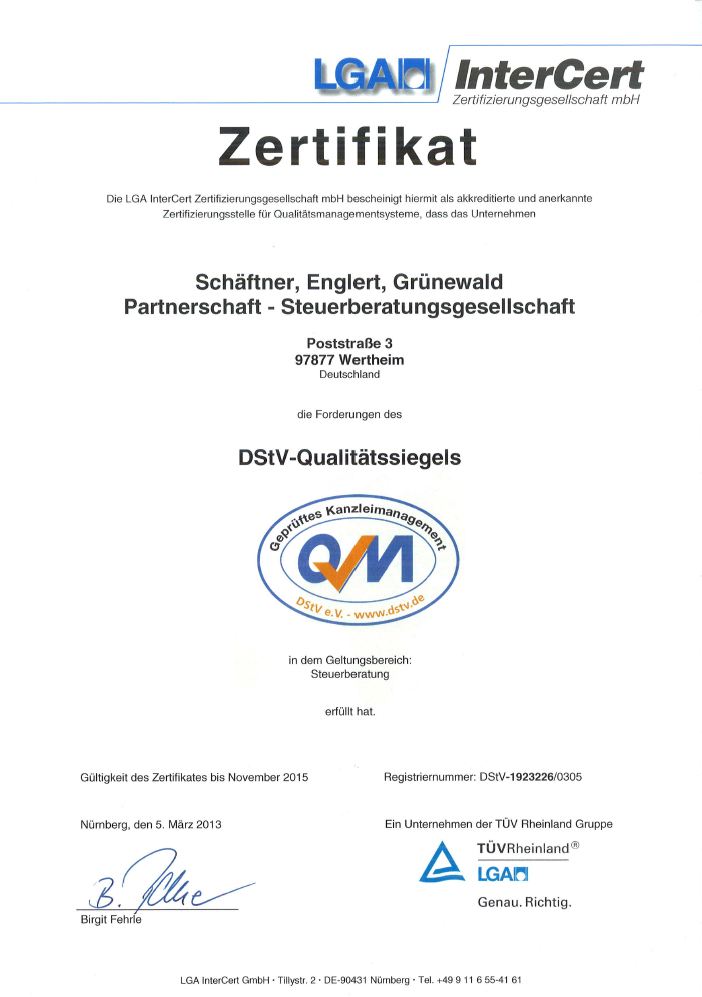 Zur Sicherung unseres Qualitätsstandards und dessen kontinuierlicher Verbesserung hat die Kanzlei ein Qualitätssicherungssystem eingeführt und ist seit November 2006 nach DIN EN ISO 9001 zertifiziert.